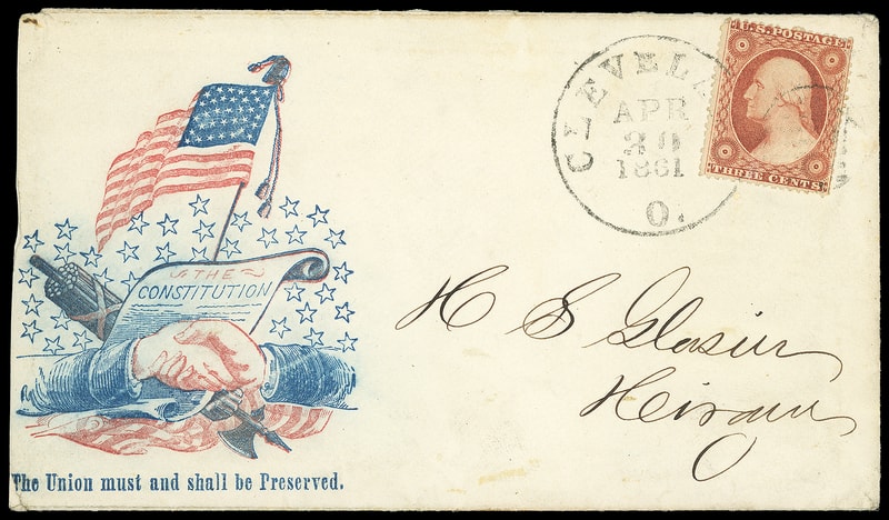 Flag, Constitution and Hands, red and blue patriotic design with verse "The Union must and shall be Preserved" on cover bearing 3¢ dull red (26) tied by "Cleveland, O. Apr 29, 1861" cds and grid duplex Hiram, Ohio; reduced at left, F.-V.F.