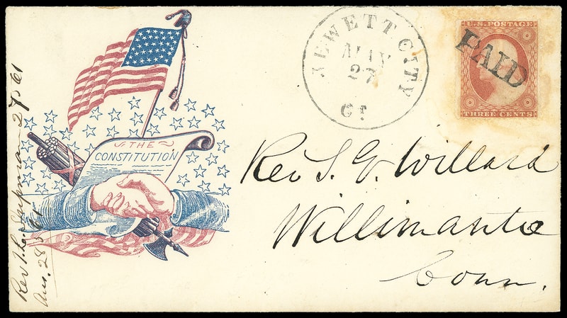 Flag, Constitution and Hands, red and blue patriotic design on cover bearing 3¢ dull red (26) canceled by bold "Paid", matching "Jewett City, Ct. May 27" cds to Williamantic Ct., original letter accompanies; light toning around adhesive, F.-V.F.