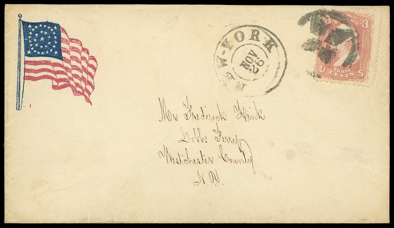 Flag, red and blue patriotic design on cover bearing 3¢ rose (65) tied by fancy geometric duplex "New York, Nov 26" cds to Dobbs Ferry N.Y., Very Fine.