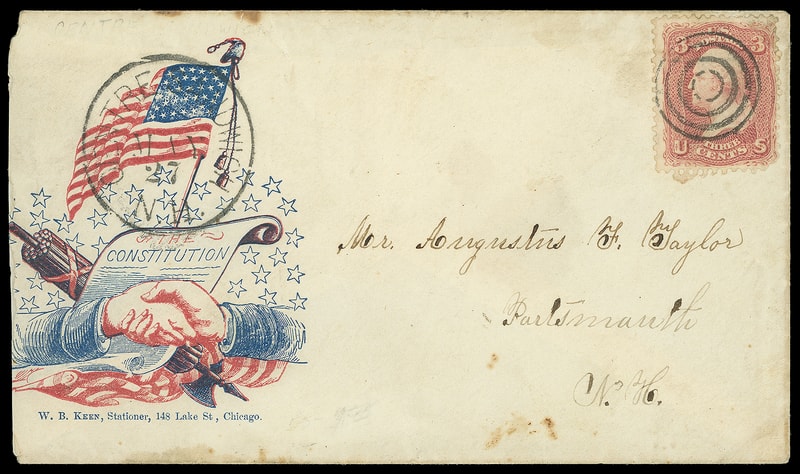 Flag and The Constitution with Clasping Hands, red and blue patriotic design with W.B. Keen Stationer of Chicago imprint on cover bearing 3¢ rose (65) canceled by four-ring target, matching "Centre Sandwich N.H. May 27" cds cancels American Flag to Portsmouth N.H.; reduced at left, Fine.