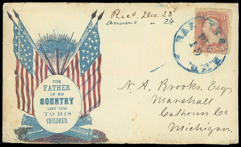 Four Crossed Flags and Two Cannons "The Father of His Country…", red and blue patriotic design on rebacked cover front bearing 3¢ rose (65) tied by blue "Baltimore Md. Dec 19" cds to Marshall, Michigan, neat docketing, F.-V.F. Weiss No. F-T-99.