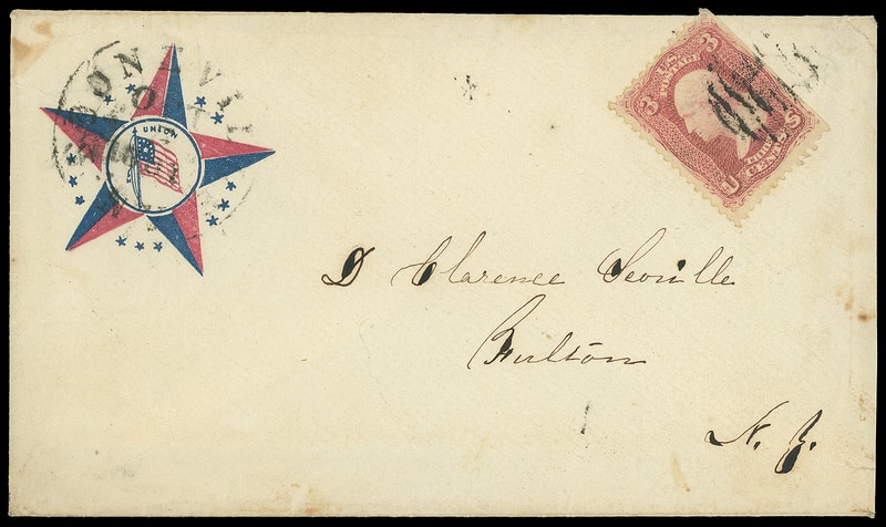 Star and Union Flag, red and blue star patriotic design on cover bearing 3¢ rose (65) , s.e. tied by grid cancel, matching "Booneville N.Y. Oct 5, 1861" cds to Bolton, N.J., F.-V.F.