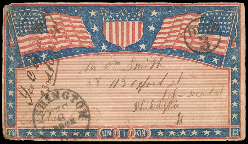 Flags and Shield, red and blue overall patriotic design on "Soldier Letter" endorsed cover with "Washington D.C., Dec 6, 1861" cds with matching "Paid 3" in Circle rating handstamp to Philadelphia Pa., endorsed "Geo. C. Spearmay, 23rd Regt. P.V." at left; edge wear and flap faults, tiny top left corner mend, otherwise Very Fine.