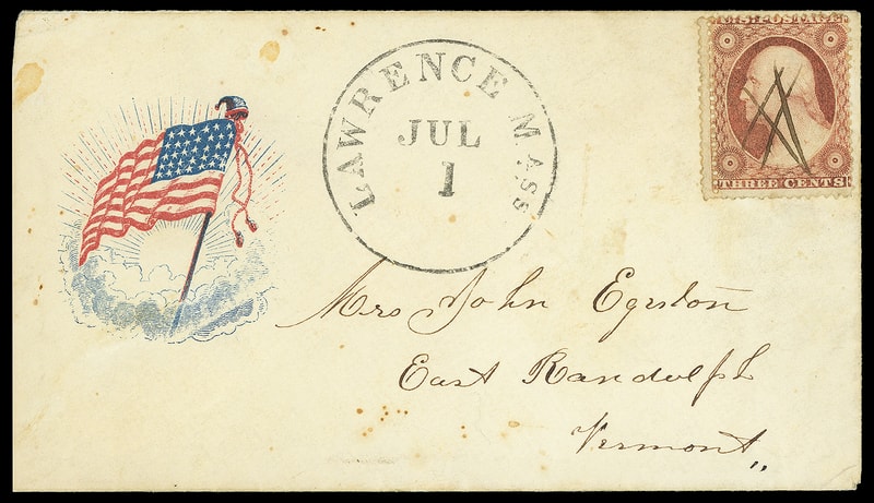 Flag in Clouds, small red and blue patriotic design on cover bearing pen canceled 3¢ dull red (26) , double perfs at left, tied by "Lawrence Ms. Jul 1" cds to East Randolph Vt.; barely reduced at left, couple minor tone spots, F.-V.F.