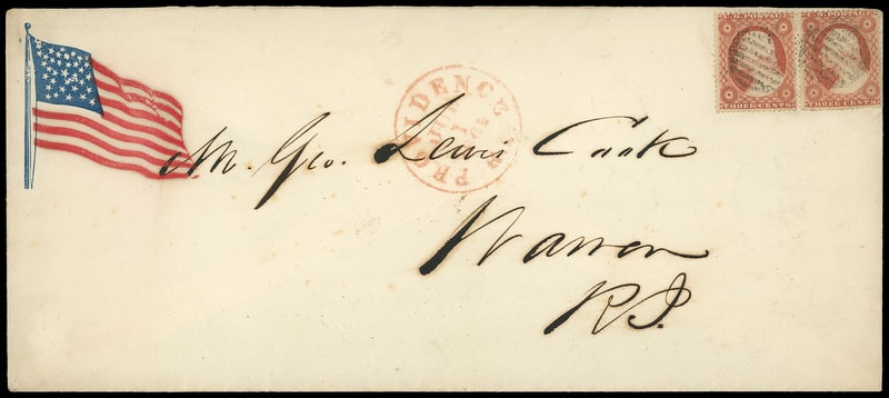 Flag, red and blue patriotic design on legal-size cover bearing two 3¢ dull red (26) singles, each canceled by circular grid cancel, red "Providence R.I. Jul 1, 1861" cds to Warren R.I.; bit of flap missing, Very Fine and scarce legal-size patriotic in outstanding condition.
