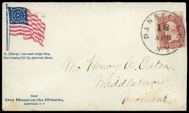 Flag and Verse, red and blue patriotic design with "From Our House on the Hillside" imprint on cover bearing 3¢ rose (65) tied by neat "Dansville N.Y. 16 Apr" cds to Middlebury Vt., additional overall advertising and map on reverse; small edge teat at top, reduced slightly at right, Very Fine and unusual patriotic advertising use.