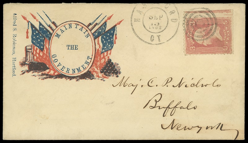 "Maintain the Government", multi-colored design showing oval with verse, flags, rifles etc, on amber cover bearing 3¢ rose (65) straddle margin single with partial guideline and part of adjoing stamp at right, tied by four-ring target cancel duplexed with "Hartford Ct. Sep 15, 1862" cds to Buffalo N.Y.; missing flap, Very Fine.