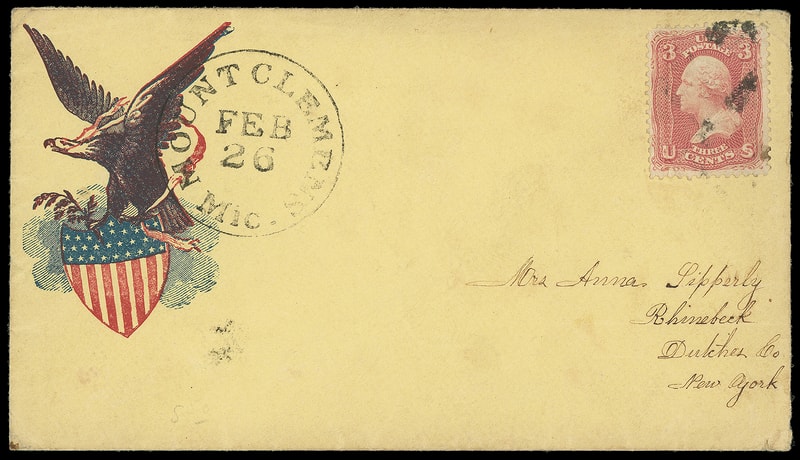 Eagle and shield, red and blue patriotic design on yellow cover bearing 3¢ rose (65) tied by cork cancel, matching "Mount Clemens, Mic. Feb 26" cds to Rhinebeck N.Y., clean and Extremely Fine patriotic used from Michigan.