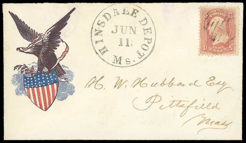 Eagle and shield, red and blue design on immaculate cover bearing 3¢ rose (65) canceled by grid, matching sharp "Hinsdale Depot Ms. Jun 11" cds to Pittsfield, Mass.; barely reduced at right, choice cover, Extremely Fine and choice.