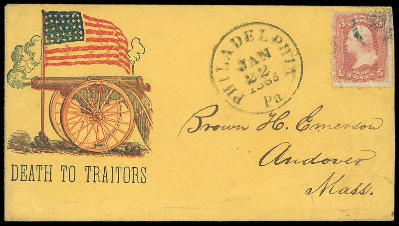 Flag and Cannon "Death to Traitors", red and blue patriotic design with blue verse on orange cover bearing 3¢ rose (65) tied by cork cancel, matching "Philadelphia, Pa. Jan 22, 1863" cds to Andover Mass.; reduced slightly at right, Very Fine.