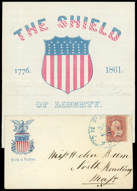 Eagle and Shield "Death to Traitors", red and blue patriotic design and verse on cover bearing 3¢ rose (65) tied by attractive blue "Frederick, Md. Dec 23" cds to North Reading Mass., partial letter with red and blue "The Shield" Shield patriotic design with contents mentioning "if he ever gets home (you wont) catch him a soldiering again, he is under arrest and has been for three months", backflap faults, Very Fine.