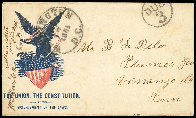 Eagle and Shield "The Union, The Constitution…", blue verse below red and blue patriotic design on "Soldiers Letter" endorsed cover showing bold "Washington D.C. Sep 17, 1861" cds with matching "Due 3" circular rating handstamp to Plumer Pa.; reduced at right, F.-V.F. and attractive.