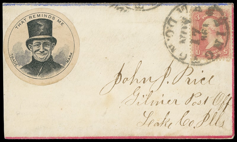 "That Reminds Me", advertising sticker on red and blue edged patriotic cover bearing 3¢ rose (65) tied by "Washington D.C. Nov 17, 1861" cds to Gilmer Ill.; reduced at left, F.-V.F. and unusual.