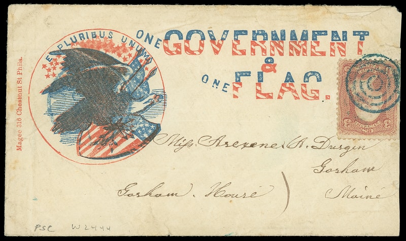 Eagle and Shield, "One Government & One Flag", red and blue patriotic design with verse, Magee imprint at left, on cover bearing 3¢ rose (65) tied by blue target to Gorham Me.; some wear, reduced at right just trimming 3¢, Fine.