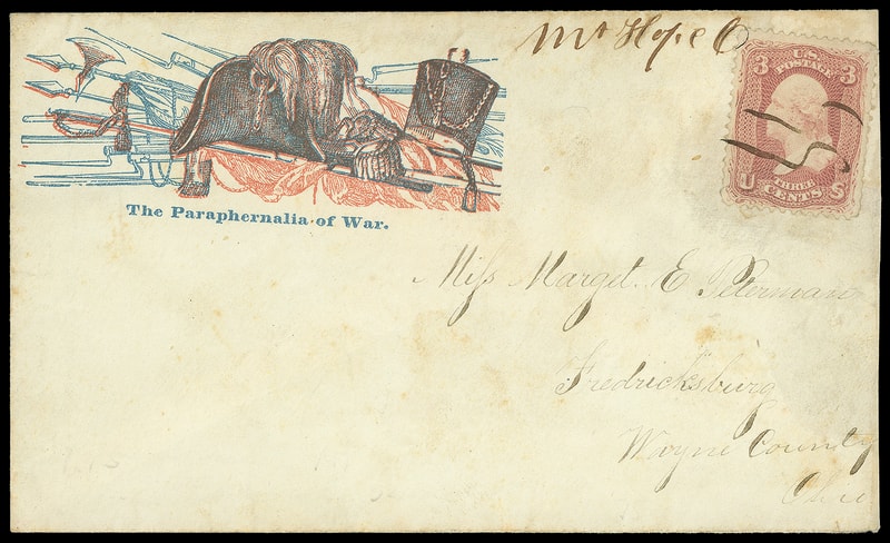 "The Paraphernalia of War", red and blue patriotic design with blue imprint below, on cover bearing 3¢ rose (65) canceled by manuscript squiggles and tied by matching " Mt Hope O " town postmark to Fredricksburg, Ohio; reduced at right, F.-V.F. and unusual scarce design.