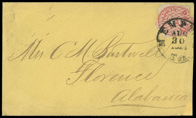 Memphis, Tenn., 1861, 5¢ red, irregular margins to in at top, tied by "Memphis Ten. Aug 30 1861" cds on yellow cover to Florence Ala.; small cover mend lower right, Fine appearance, ex-Matz.