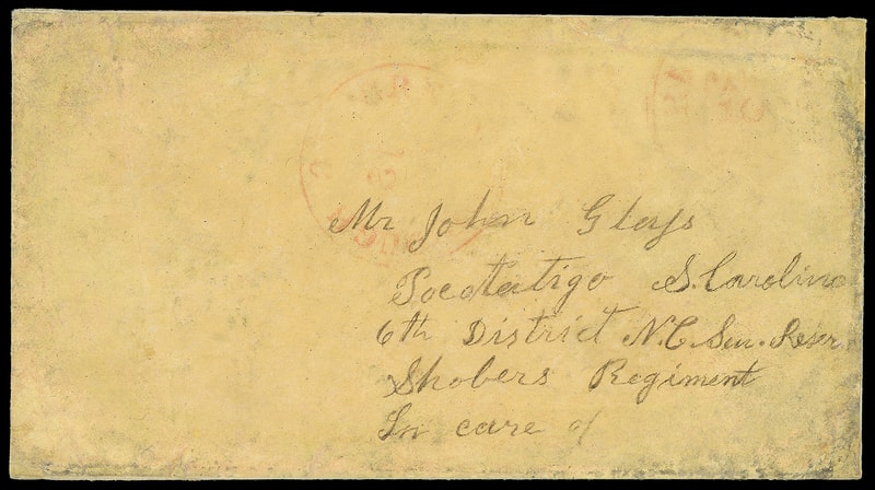 Greensboro, N.C., 1861, 10¢ red, faint red strikes of provisional handstamp and "Greensboro N.C." cds on amber cover with military address to John Glass, Pocotaligo S.C., 6th District N.C., Shobers Regiment; cleaned with address partially reinked and edge repairs, Fine, only 8 recorded in Crown Surveys .