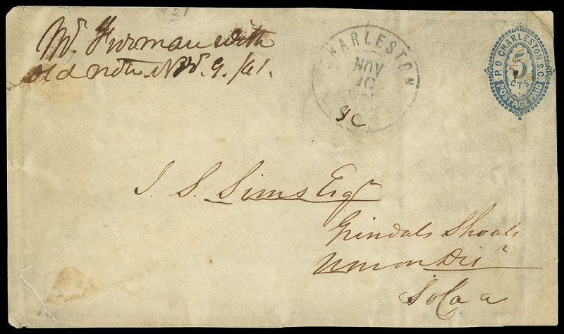 Charleston, S.C., 1861, 5¢ blue, white entire rebacked front with "Charleston S.C. Nov 10 1861" cds addressed to J.S. Sims Esq. of Grindals Shoals, S.C., docketed "M. Furman with old note Nov. 9/61"; some soiling and faults, corner repair, Fine; signed Kimbrough.