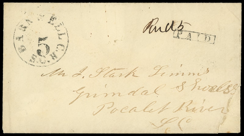 Barnwell Court House, S.C., 1861, 5¢ black, provisional markings at left with boxed "Paid" handstamp on cover to Grimdal Shoals S.C., additional manuscript "Paid 5"; repaired lower right corner, repaired lower corner in need of professional restoration still appearing, Very Fine appearance, only 8 recorded .