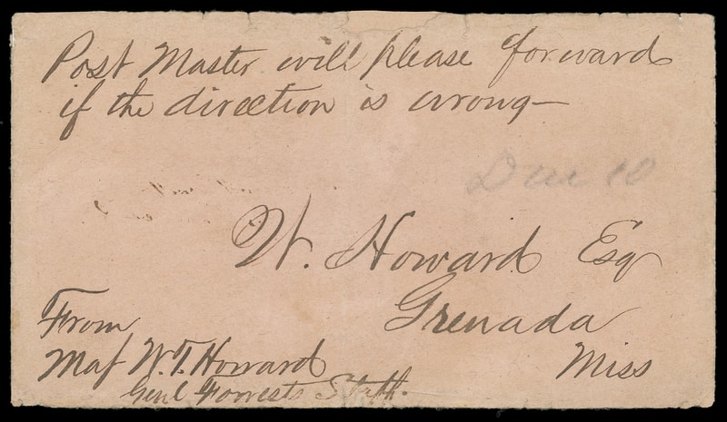 Army of Tennessee "Due 10", pencil rating on salmon buff cover endorsed " From Maj. W.T. Howard, Genl. Forst's Staff " and " Post Master will please forward if the direction is wrong " to Grenada, Mississippi; small edge tears and wear, small edge mend at top, flap missing, F.-V.F.