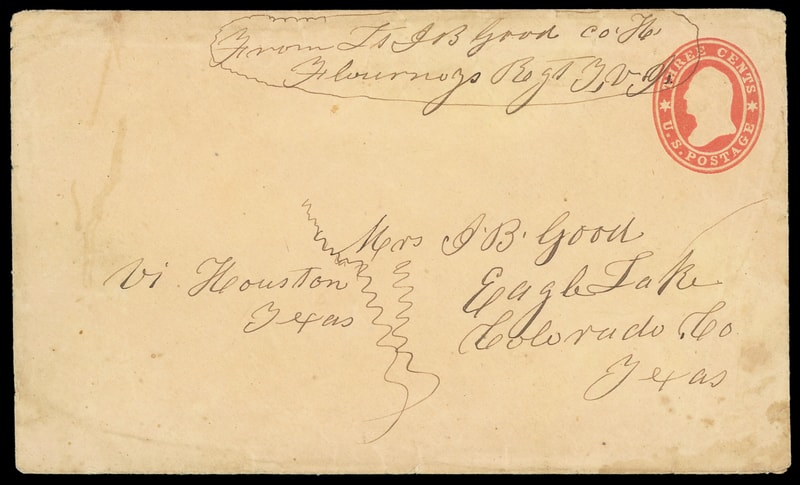 "From Lt. J.B. Good, Co. H, Flournoys Regt. T.V.I.", manuscript endorsement on U.S. 3¢ red (U27) Star die buff entire addressed to Mrs. J.B. Good, Eagle Lake, Colorado Co., Texas, endorsed "Via Houston, Texas"; some edge wear, partial flap, F.-V.F. and scarce Texas use.