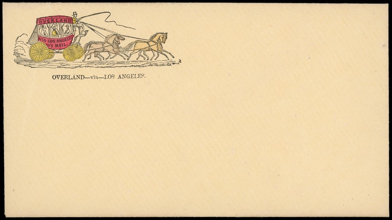 Overland via Los Angeles, hand-colored illustrated four-horse stagecoach design on mint buff cover, Extremely Fine.