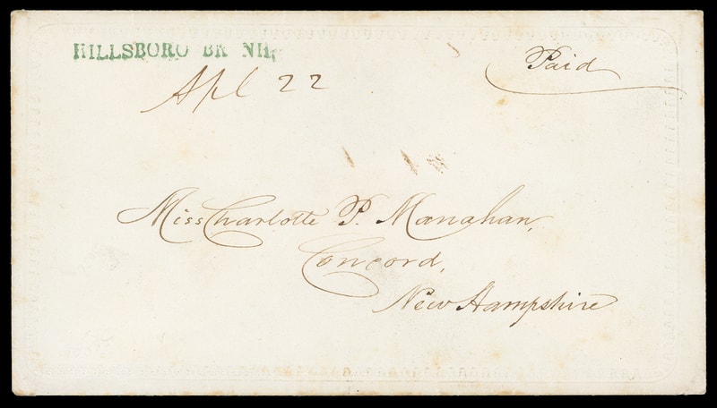 HILLSBORO BR NH "Apl 22", green straightline postmark with manuscript date and matching "Paid" on circa 1845 embossed Valentine to Concord N.H. few toned spots, Very Fine and attractive.