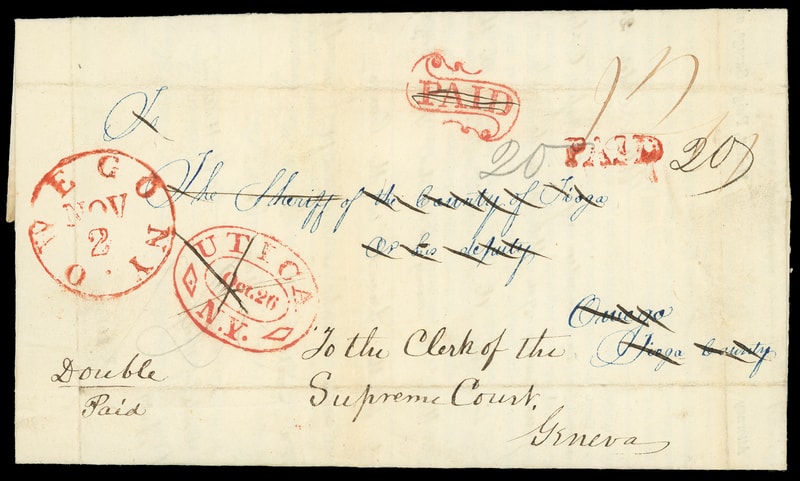 Utica N.Y., Oct. 26, fancy red double-oval postmark with matching "Paid" scroll handstamp with "12½" cent rating to Oswego N.Y., markings crossed out and remailed with red " Oswego N.Y., Nov 2 " cds with matching "Paid" handstamp and ms. "20" rating to Geneva N.Y.; filing folds, F.-V.F. and colorful fowarded use.