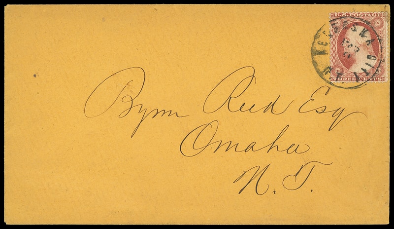 Nebraska City N.T., Mar 9 (Nebraska Territory), neat territorial cds ties 3¢ dull red (26) on orange cover to Omaha, Nebraska Terr., Very Fine.