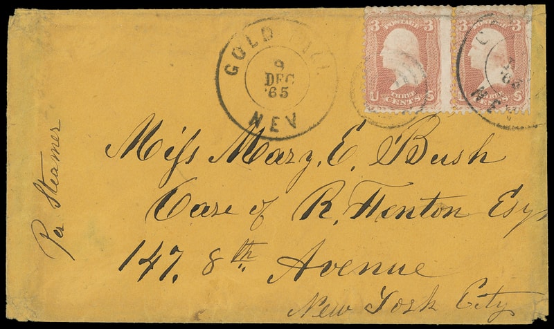 Gold Hill, Nev. 9 Dec '65, duplex with four-ring cancel ties 3¢ rose (65) pair on 1866 orange cover to New York City, endorsed "Per Steamer" at left, ms. "rec Jan 18 66" receipt docketing; some edge wear, reduced at right, F.-V.F.