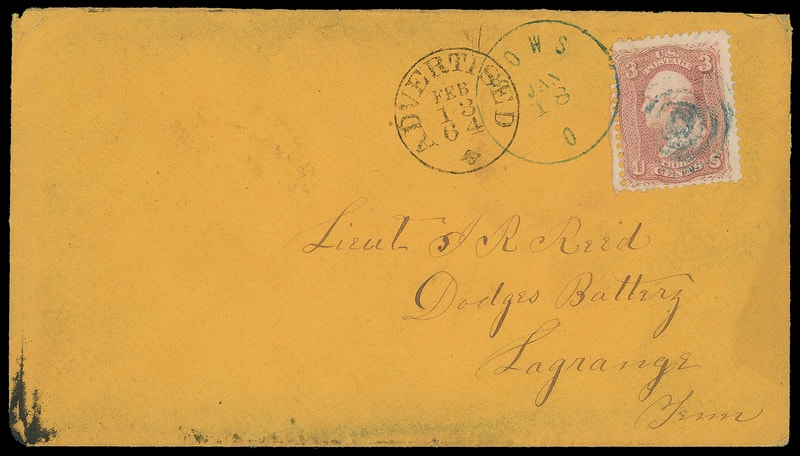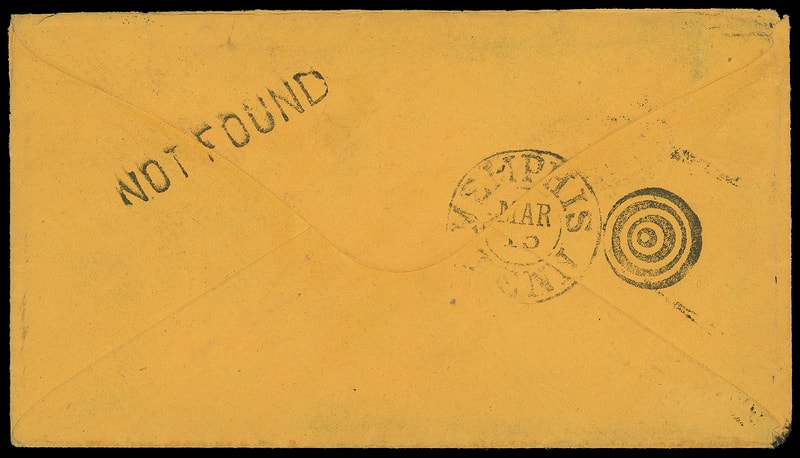 Memphis Tenn. "Advertised, Feb 13, 64", cds with matching "Memphis, Tenn. Mar 15" duplex and "NOT FOUND" straightline on 1864 orange cover bearing 3¢ rose (65) tied by blue four-ring target and "Bowes O. Jan 18" cds addressed to Lieut. J.R. Reid, Dodges Battery, Lagrange Tenn.; some edge wear with some black ink at bottom left, F.-V.F.