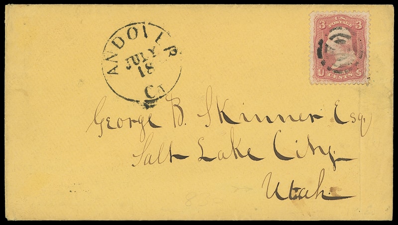 Salt Lake City, U.T. Sep 11, partial cds with matching small " Adv'd, Aug. 17. " two-line advertised handstamp and "NOT CALLED FOR" straightline on reverse of yellow cover bearing 3¢ rose (65) canceled by segmented target cancel, matching "Androver Ct. July 18" cds to Salt Lake City, Utah Territory, Very Fine.