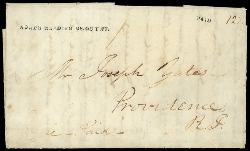 North Reading Ms. Oct 27, complete and well struck 42x2mm straightline with matching "Paid" straightline and manuscript "12½" cent rating on folded letter to Providence RI, manuscript "paid" at lower left, with contents, Very Fine and scarce straightline.