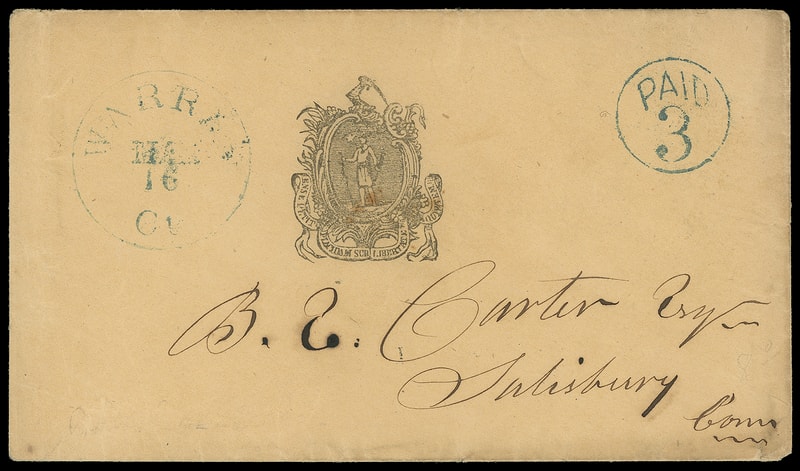 Warren Ct. Mar 16, well-struck blue 32mm cds with matching blue " Paid 3 " in circle rating handstamp on illustrated cover with Mass. coat-of-arms to Salisbury Mass, Very Fine.