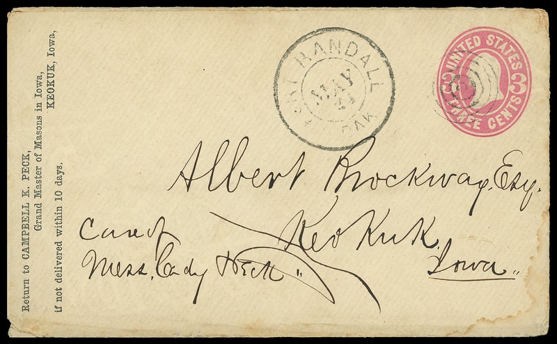 Fort Randall, Dak, May 14, cds and matching four-ring cancel on 3¢ pink (U58) entire to Keokuk, Iowa; flaws, nice Dakota territory fort usage, F.-V.F.