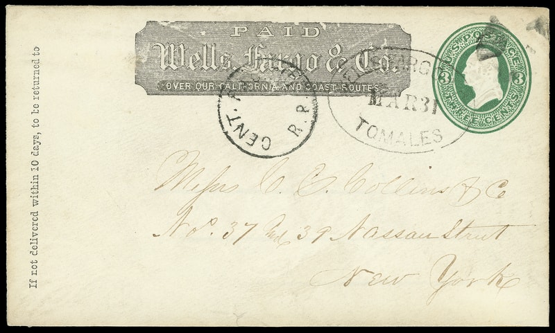 Wells Fargo & Co., Tomales, Mar 31, black oval cancels 3¢ green entire with black printed Wells Fargo frank to New York City, entered mails with " Cent. Pacific R.R. " cds at the railhead, Very Fine and scarce use from Tomales via the Central Pacific.