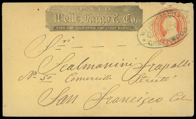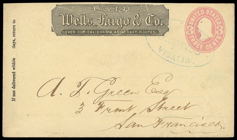 Wells Fargo & Co., Vallejo, Oct 8, blue oval datestamp cancels 3¢ green entire with printed "Wells, Fargo & Co." frank to San Francisco Cal.; reduced at right, F.-V.F.