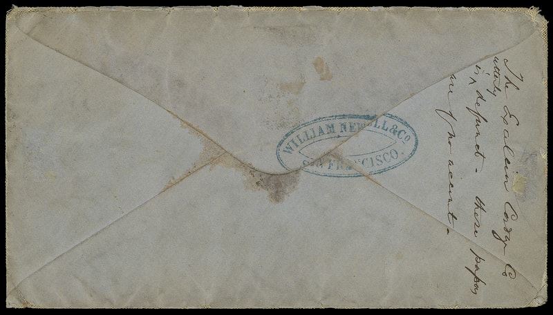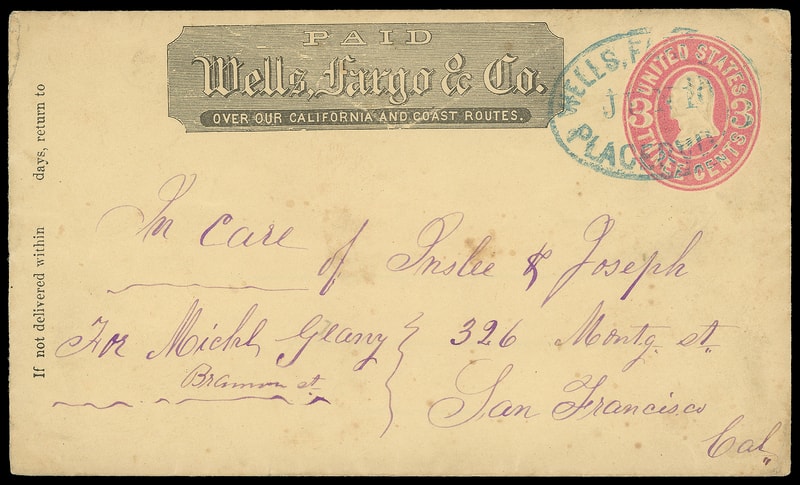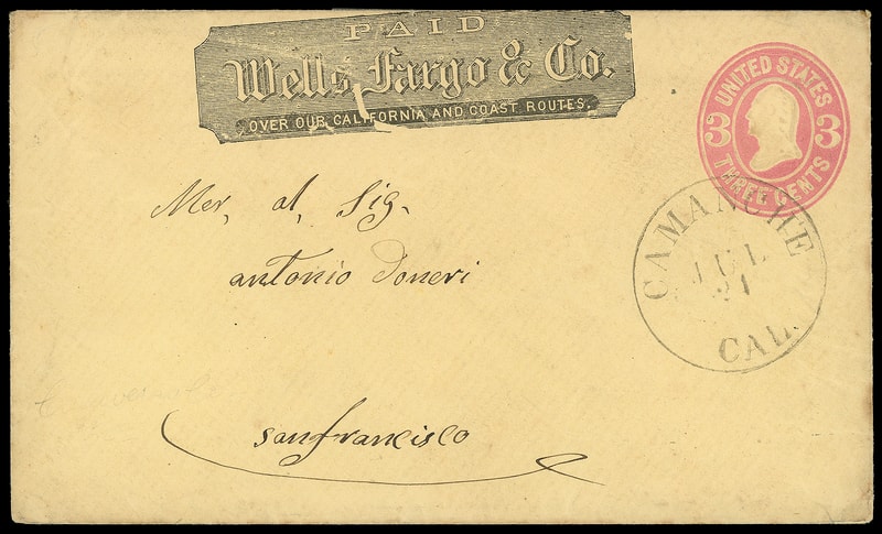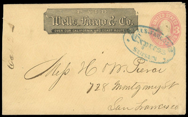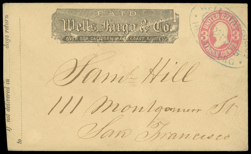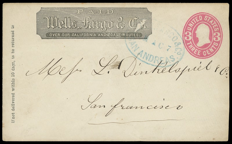 Wells, Fargo & Co., San Andreas, Mac 7, blue oval on 3¢ pink (U58) entire with printed "Wells, Fargo & Co." frank to San Francisco Cal.; abrasion, F.-V.F.