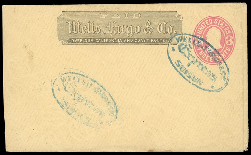 Wells, Fargo & Co. Express, Suisun, blue oval cancels 3¢ pink (U59) buff entire with printed "Wells, Fargo & Co." imprint to San Francisco Cal., reverse with unaddressed paste-up 3¢ pink (U59) buff entire canceled by two strikes of Suisun blue oval; reduced slightly at left, Very Fine intact paste-up use.