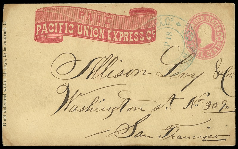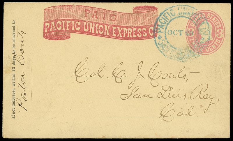 Pacific Union Ex. Co., San Francisco, Oct 20, double-circle datestamp cancels 3¢ pink (U58) entire with red Pacific Union Express Co. Paid frank to San Luis Rey, Cal., Very Fine.
