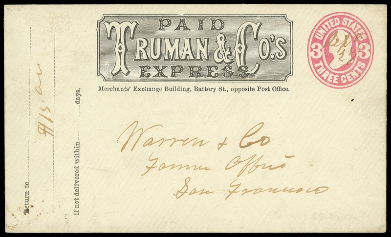 Truman & Co's Express, paid frank on 3¢ pink (U58) entire canceled by ms. "Sept 27" cancel to San Francisco Cal., docketed "$15.00" at left, Very Fine.