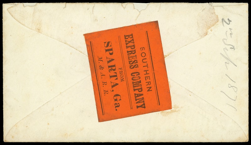 Southern Express Company, Sparta, Ga. M. & A. R.R., black on orange label affixed to reverse of 3¢ green (U82) entire to Hon. Alexander H. Stephens, Crawfordville Ga. endorsed " By Express ", ms. " Paid 2/- " express rating, pencil "2nd Sep 1871" docketing on reverse; small opening tear and small bit of flap missing, F.-V.F.