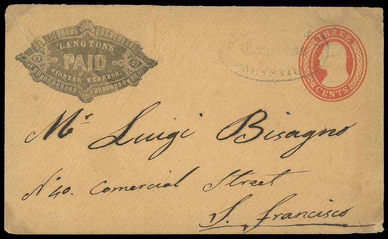 Langtons Pioneer Express, fancy paid frank on 3¢ red (U10) buff Nesbitt entire canceled by partial " Wells Fargo & Co. Express, Marysville " company oval to San Francisco Cal.; corner tear, partial flap, Fine and scarce conjuctive use.