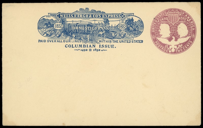 Wells, Fargo & Co. 1892 Columbian Issue, blue printed frank on 2¢ Columbian (U349) mint entire, Very Fine.