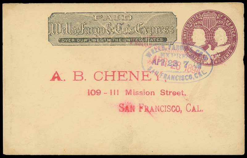 Wells Fargo & Co., "Passed Sacramento Cal. Depot, Apr 28 1894", red two-line handstamp cancels 2¢ Columbian (U349) entire with printed Wells Fargo frank to San Francisco Cal., blue "Wells, Fargo & Co's Express, San Francisco, Cal. Apr 28" arrival oval, additional blue company flap oval, Very Fine and rare.