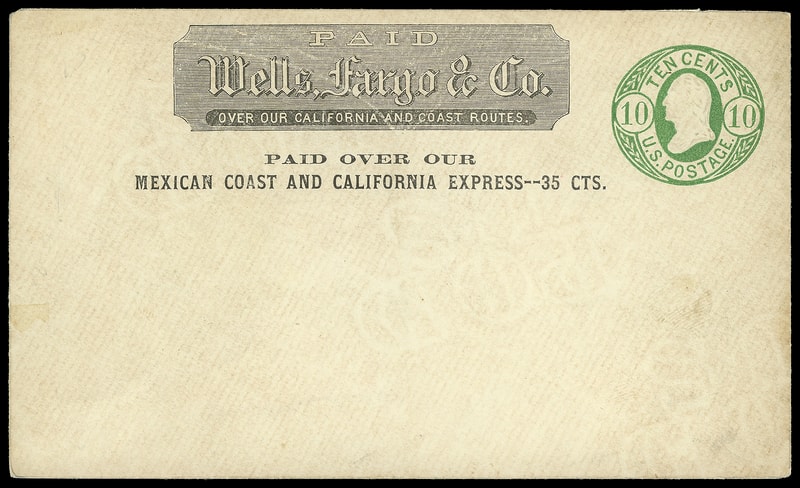 Wells Fargo & Co. "Paid over out Mexican Coast and California Express -- 35 Cts.", printed frank on 10¢ green (U40) unused entire; faint soiling, F.-V.F.