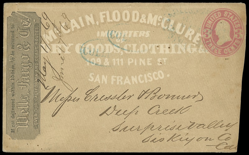 Wells, Fargo & Co., San Francisco, Jun 15, blue oval cancels 3¢ pink (U58) entire with overall tan "McCain, Flood & Mcclure, Importers of Dry Goods, Clothing &c., San Francisco." shaded ad to Deep Creek, Surprise Valley Cal., two partial "Collect" ovals, ms. "June 17 - 69" docketing at left; some adherence on reverse from paste-up, reduced at right, Fine.