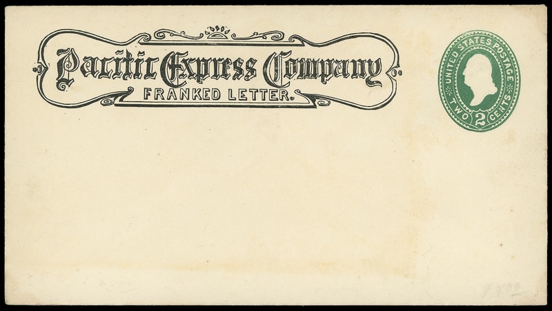 Pacific Express Company, Franked Letter, fancy printed frank on mint 2¢ green entire, F.-V.F. and scarce frank.