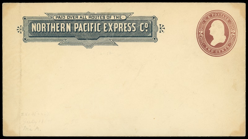 Northern Pacific Express Co., fancy printed frank on mint 2¢ red brown entire; light vertical fold at left, light corner toning, F.-V.F.