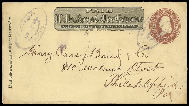 Wells Fargo & Co.'s Express (Montana Territory), printed frank on 2¢ brown on amber entire canceled by blurry violet "Stone Station, Deer Lodge Co., Montana, Apr 13, 1886" ovals to Philadelphia Pa., Apr. 18th arrival backstamp; small top edge tear, minor wear, F.-V.F.